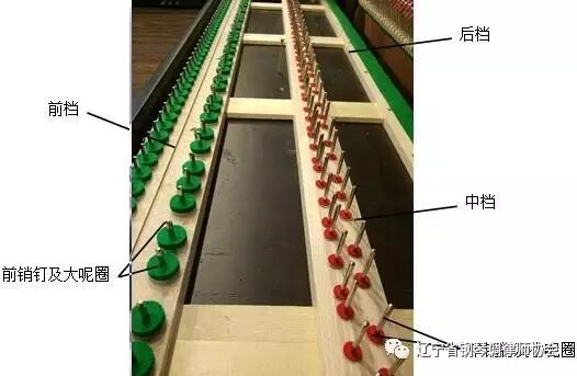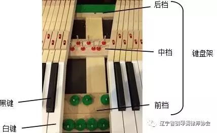 键盘架装于中盘之上,用来稳固所有琴键。分为前档、中档、后档。其中,前档的前销钉用于琴键前端的固定与定位,中档的中销钉用于琴键中部的固定,二者均装有消除杂音的呢垫圈与纸圈。键盘架后档安装着卡钉,用于触发联动器。